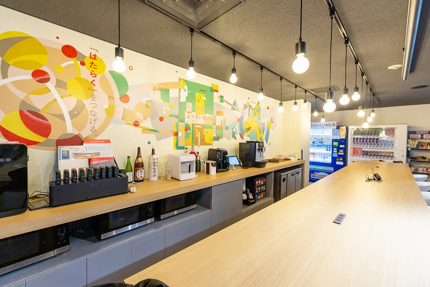 壁一面に大型のアートを設けました。弊社のMVV(ミッション・ビジョン・バリュー)と中長期ビジョンを、テキストではなくアートとして落とし込んでいます。文字による掲示は日常に埋もれやすい。アートとして空間に存在することで、社員が自然と理念を意識できます。来客との会話のきっかけにもなり、自分たちの言葉で会社の姿勢を伝えられる場になっています。