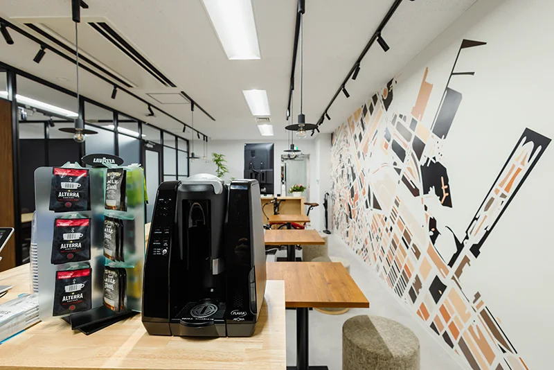 スペースの制約上、本社と同数の飲料ラインナップを揃えることは難しい状況でしたが、コーヒーメーカーを設置しています。購入には給与天引き型のキャッシュレス決済システムを導入しています。