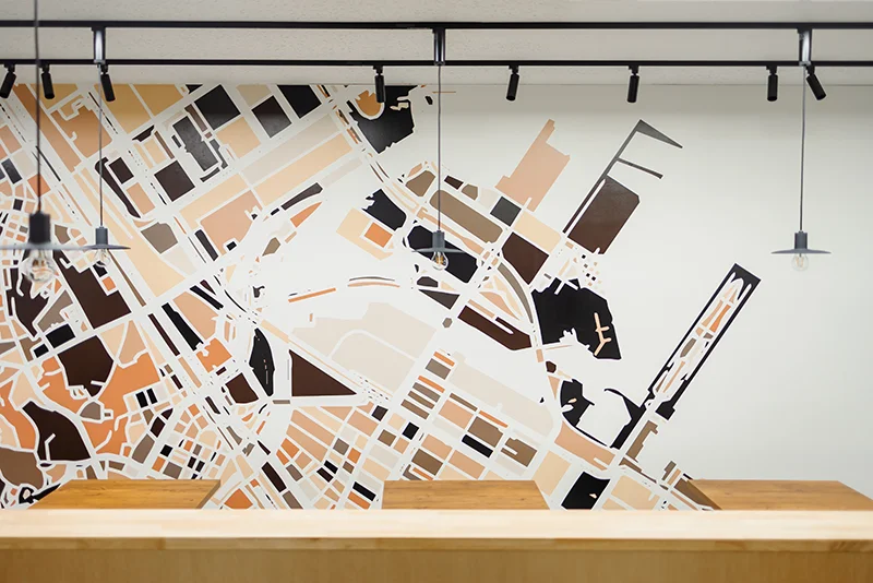 | この拠点ならではの記憶に残る空間 | 横浜を中心とした地図を壁面アートとして設置 |