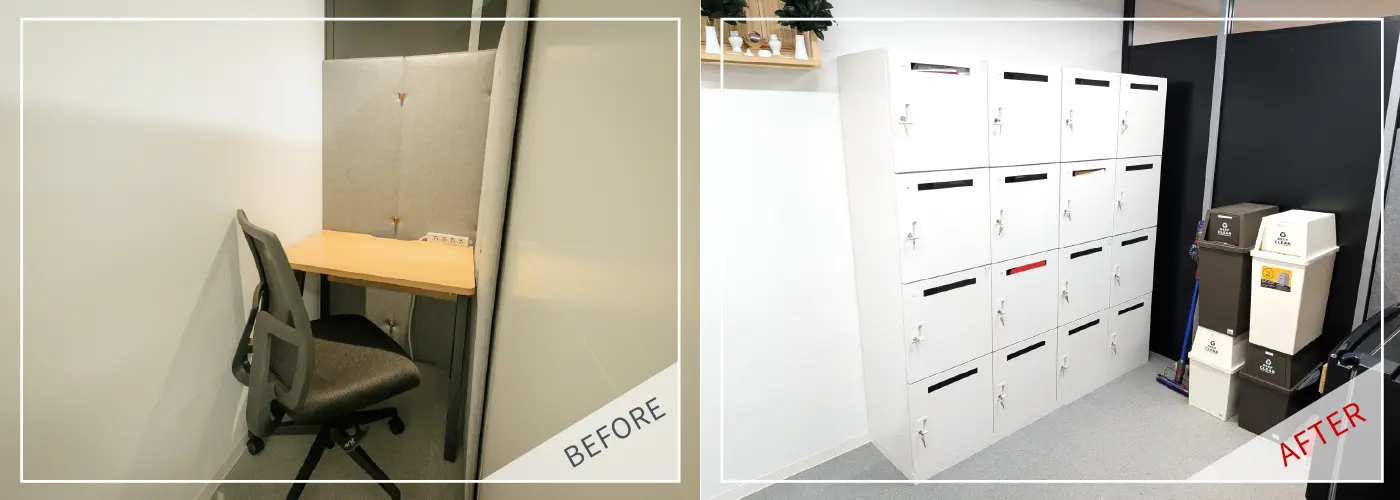 そこで現在はこのスペースの活用方法を見直し、冷蔵庫やウォーターサーバーなどの水回り設備と収納エリアに転用しています。オフィスは入居時に作って完成ではなく、使いながら育てていくもの。使われていないスペースをそのままにせず、オフィス全体の使い勝手向上につなげた事例です。