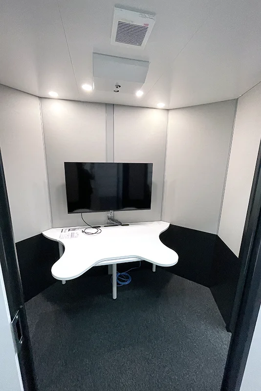 この「3名用」というサイズ感が非常に使い勝手よく、1〜3名でのWEB面談はもちろん、1on1や少人数の社内ミーティングにも活用できます。会議室がもう1室増えたような利便性を、コンパクトな空間の中で実現しています。実際に体感いただける設備として、ご来社のお客様にもご覧いただいています。
