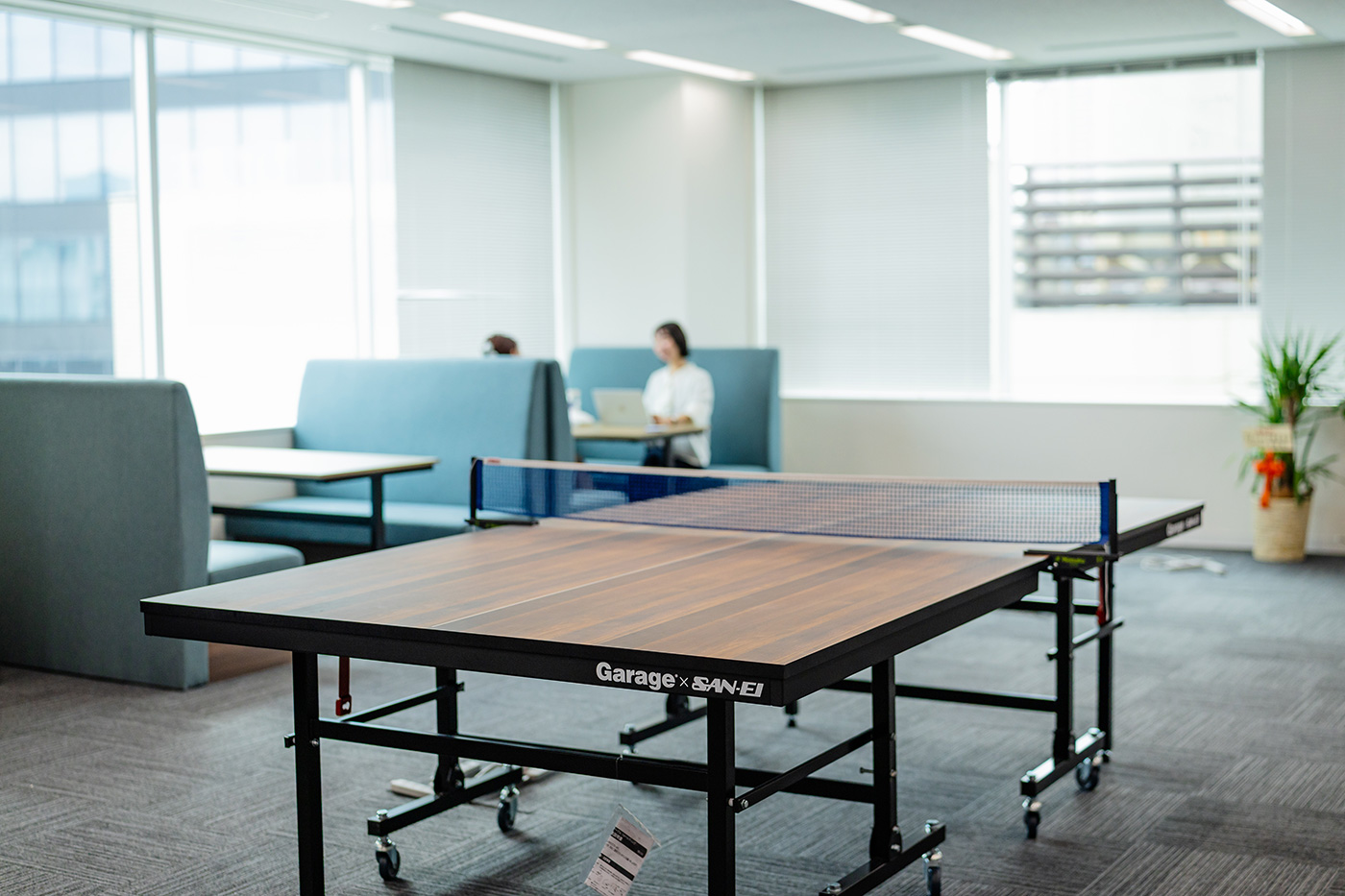 フリースペースには卓球台やバーカウンターを設置し、部署や役職を越えた交流が活発化しています。終業後に卓球を楽しんだり、社内イベントを開催したりと、日常的に人が集まる場として機能しています。
